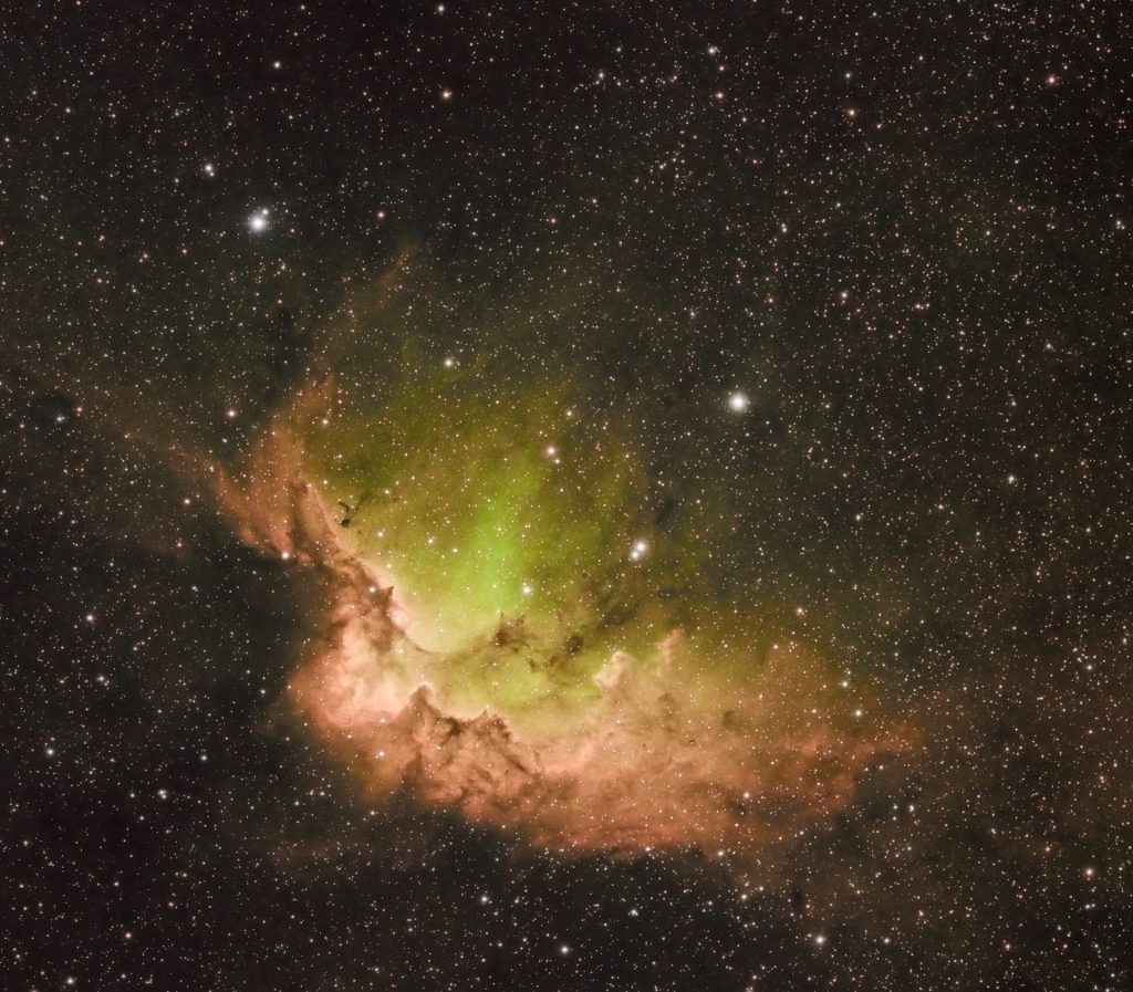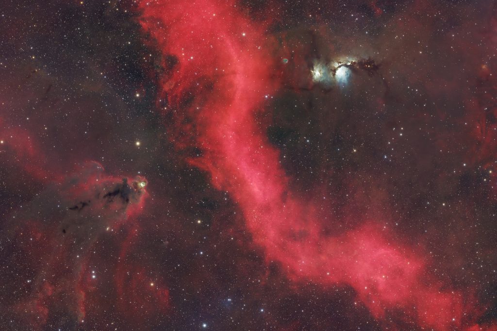 Also known as SH2-142, this emission nebula appears in photographs as a medieval wizard doing an incantation. Located 8,500 light years away, the Wizard Nebula lies in the Perseus Arm of our galaxy. The nebula is about 110 light years in diameter, Within the nebula is the open cluster NGC 7380, a group of hot blue stars being born in the nebula. These stars are between 4-12 million years old and their radiation is ionizing the hydrogen gas in the nebula, causing it to glow. At least fourteen stars in the cluster are pre-main sequence stars that have not yet begun nuclear fusion.