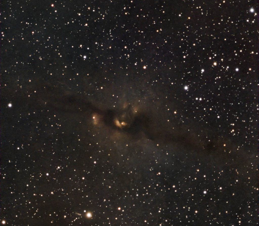 Also known as LDN 43, this nebula looks like a head-on view of a bat flying at the viewer. It is, in fact, a stellar nursery that is of great interest to astronomers studying star formation. Located 1400 light-years away, it spans twelve light-years in length. This is a “dark nebula”, a molecular cloud that is dense enough to block light from background stars. The nebula is lighted from inside by dense gaseous knots that have just formed young stars. Stars are born from cosmic dust and gas, which float freely in space until gravity forces them to bind together. One of the hidden newborn stars in this nebula, named RNO 91 is a pre-main sequence star, meaning that it has not yet started burning hydrogen in its core. Rather, its luminescence comes from gravitational contraction, compressing the star until critical mass is reached and it begins to fuse hydrogen. It is only about one million years old.
