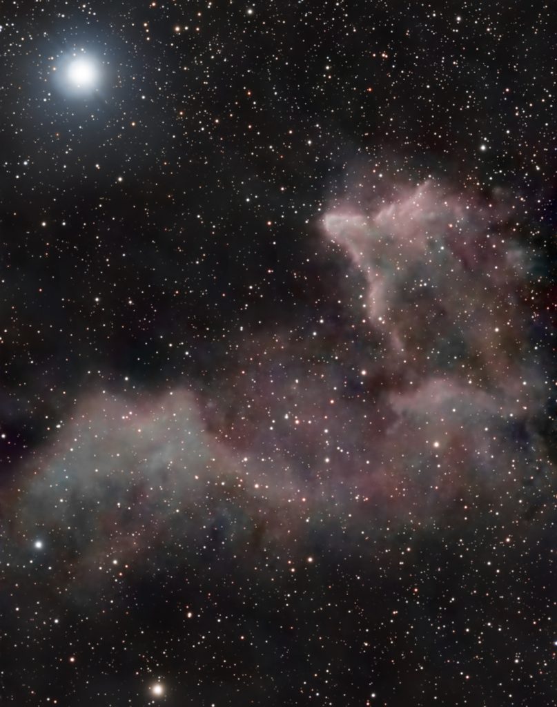 Also known as IC63, this is both an emission and a reflection nebula, located 550 light years from earth. The nebula is illuminated by the star Gamma Cassiopeiae, which is the bright star in the upper left-hand corner of this image. Gamma Cassiopeiae is an unusual star. It is large- nineteen times more massive and 65,000 times brighter than our Sun. It is also a variable star: blue-white variable star that is surrounded by a gaseous disc. This star is nineteen times more massive and 65,000 times brighter than our Sun. It also rotates at 970,000 miles per hour, over two hundred times faster than the Sun. This rotation ejects mass from the star into a disk surrounding the star, as well as causes it to vary in brightness. It also creates intense radiation. Despite being 3-4 light-years away from IC63, the radiation from Gamma Cassiopeiae is sufficient to excite the hydrogen atoms in IC63, causing it to glow red. This is evident from the pinkish hue around the ghost’s “head” in this image. The blueish color in the lower left portion of the nebula is caused by the reflection of light from Gamma Cassiopeiae. Thus, IC63 is both an emission and a reflection nebula. Observations of the nebula’s velocity show that different parts of the nebula are moving at different speeds, indicating that the intense radiation from Gamma Cassiopeiae is slowly ripping IC63 apart, and it will be gone in 500,000 years.