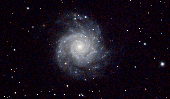 M-74 is located about 32 million light-years from Earth and is about 85,300 light-years in diameter with a total mass of about 300 billion solar masses, containing about 100 billion stars. In comparison, while our Milky Way galaxy is similar in diameter, being about 87,000 light-years across, it is much more massive, weighing in at 1.5 trillion solar masses. This increased mass is due to a halo of “dark matter “surrounding our galaxy.