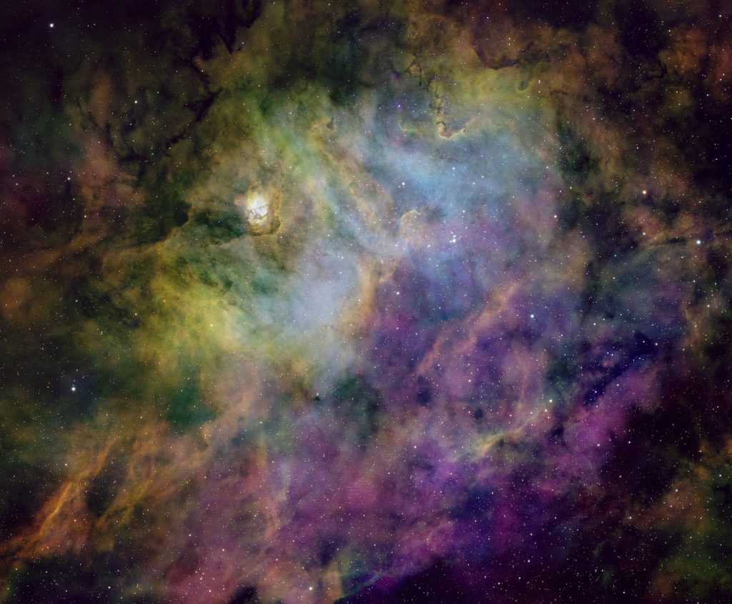 SH2-54 is an emission nebula, a cloud of interstellar gas and dust that emits its own light when a nearby star’s ultraviolet radiation energizes the gas, causing it to ionize and glow. In this photo, red indicates the presence of ionized sulfur, green represents ionized hydrogen, and blue represents ionized oxygen, with the yellow, purple, and orange colors caused by varying mixtures of these three gases. It is located approximately 6200 light-years from Earth, so the light from this image began its journey when humanity was entering the early Bronze Age and early writing was being developed. This nebula is an active star-forming region, containing more than 100 very hot stars that are only about 4-5 million years old. In human terms, an average star that is five million year-old has existed for the same fraction of its lifespan as a two-day-old human infant.
