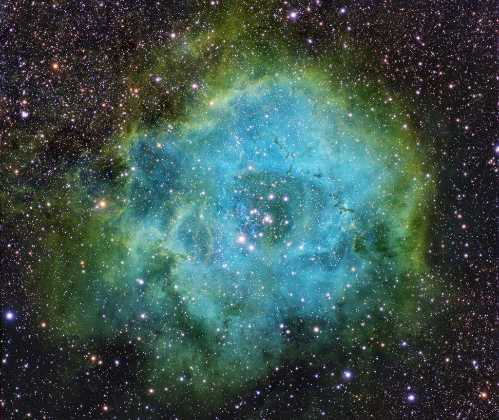 Also known as the Rosetta Nebula, SH2-275 or Caldwell 49 (C49). Like the Scary Face nebula above, SH2-275 is an emission nebula —a cloud of interstellar gas and dust excited by nearby stars, which ionize and glow the gas. In the case of the Skull/Rosetta Nebula, there is an open cluster of stars in the center of this image in what appears as “left-eye socket” of the nebula. Two of the stars (HD 46223 and HD 46150) in this cluster are extremely hot and large, estimated at 400,000 to 450,000 times brighter and 50-60 times more massive than our sun. The stellar winds from their intense radiation push the nebula’s gas and dust outwards, creating a shell of ionized, glowing gas that forms the “bubble” or “eye socket” of the nebula. This central region is also extremely hot. While the main body of the nebula is heated to around 17,540° F, in this central region, the temperature rises to as high as 17,999,540° F. It is an active star-forming region, with approximately 2500 young stars of 2-4 million years old residing within the nebula. Right next to this extremely hot region are areas known as “Bok globules.” In this image, you can see some near where the “left eyebrow” of the skull would be. These are dense clumps of gases and some dust and are the precursors to a protostar. This dense matter shields the hot and brilliant radiation from the nearby central core of the nebula, causing temperatures in the Bok globules to reach as low as -450° F.