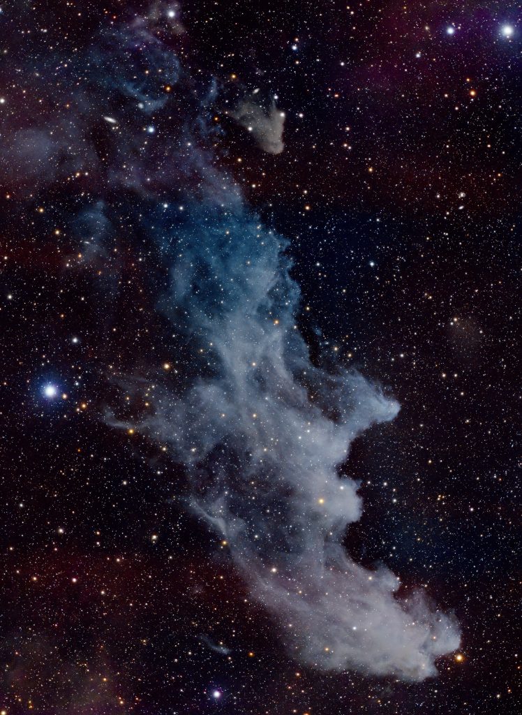 The Witch Head Nebula received its name because, as Monty Python once pointed out, it looks like one. Also known as IC 2118 and NGC 1909, it is a reflection nebula that is illuminated by light reflected from the nearby blue supergiant star Rigel. The bluish color of the nebula is caused not only by blue light emitted from Rigel, but also because the dust grains in the nebula reflect blue light more efficiently than red, similar to the process that causes earth’s sky to appear blue. IC2118 lies about 900 light-years from Earth, and is about 70 light-years in length. It may also be the remnant of an ancient supernova. Radio observations show substantial carbon monoxide emission throughout parts of IC 2118, indicating the presence of molecular clouds and star formation in the nebula. Some possible pre-main-sequence stars have were discovered deep within the nebula, around the “chin” and “lower jawline” in these images.