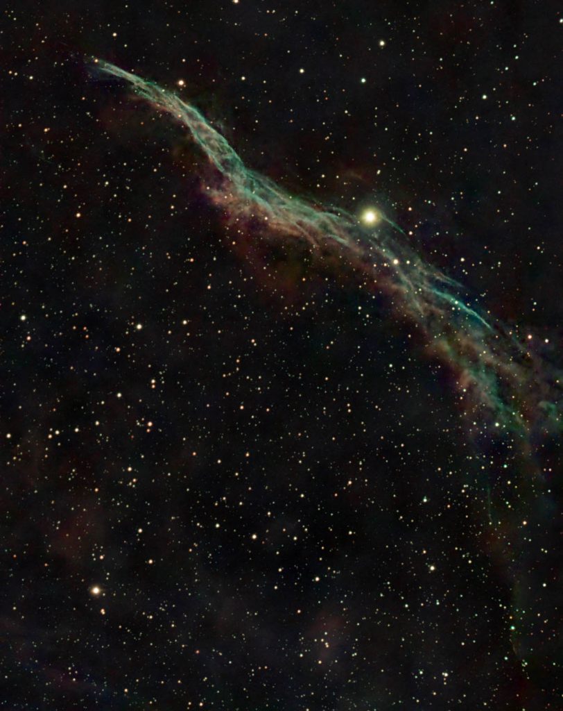 Also known as the Western Veil Nebula or NGC6960, this is a remnant of a supernova that exploded 15,000 years ago. It lies approximately 1,400 light years from earth, and spans about thirty-five light years in diameter.
